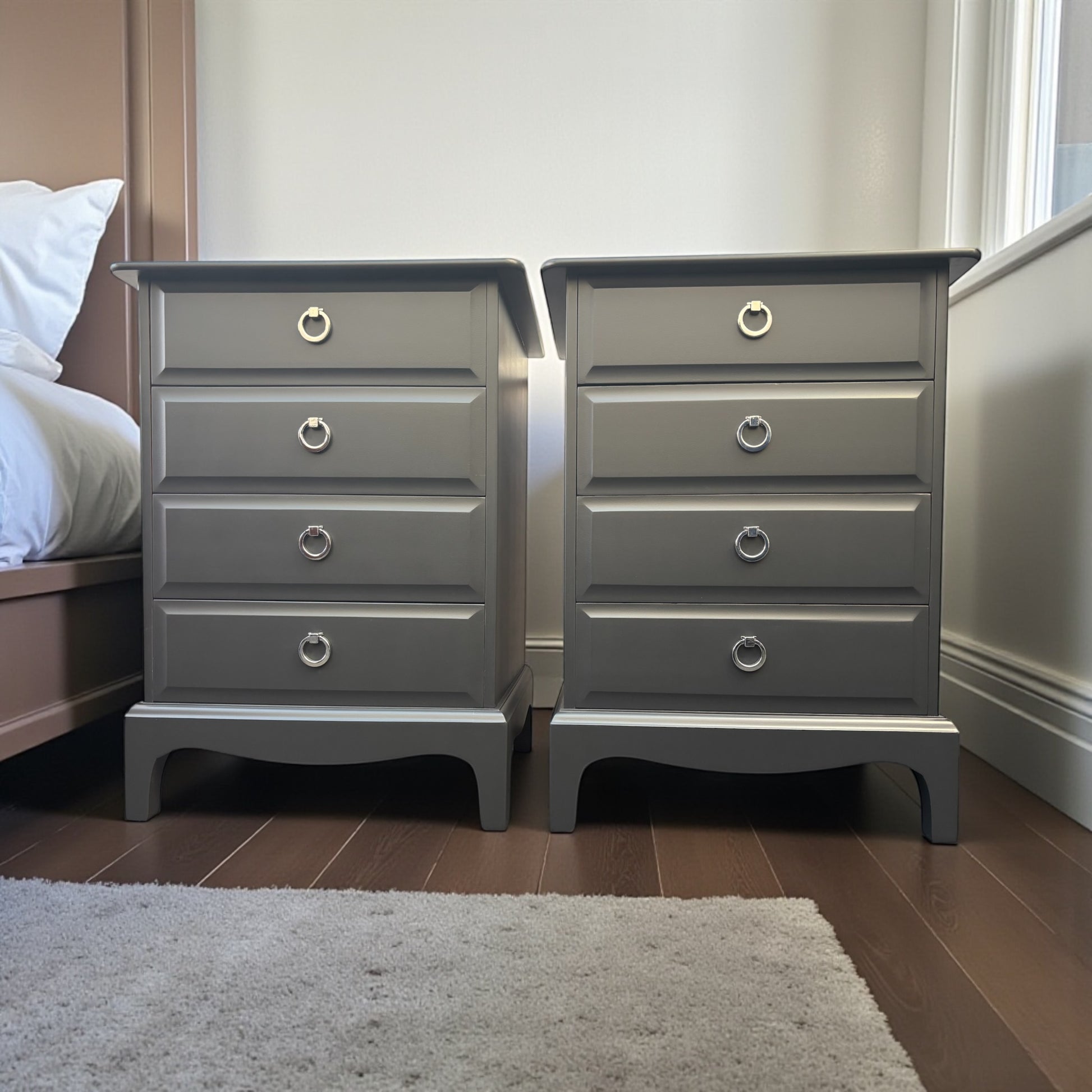 Vintage 1970s/1980s Newly refurbished Stag Minstrel pair of 4 drawer bedside drawers available for refinishing in your choice of colour. Matching furniture also available.